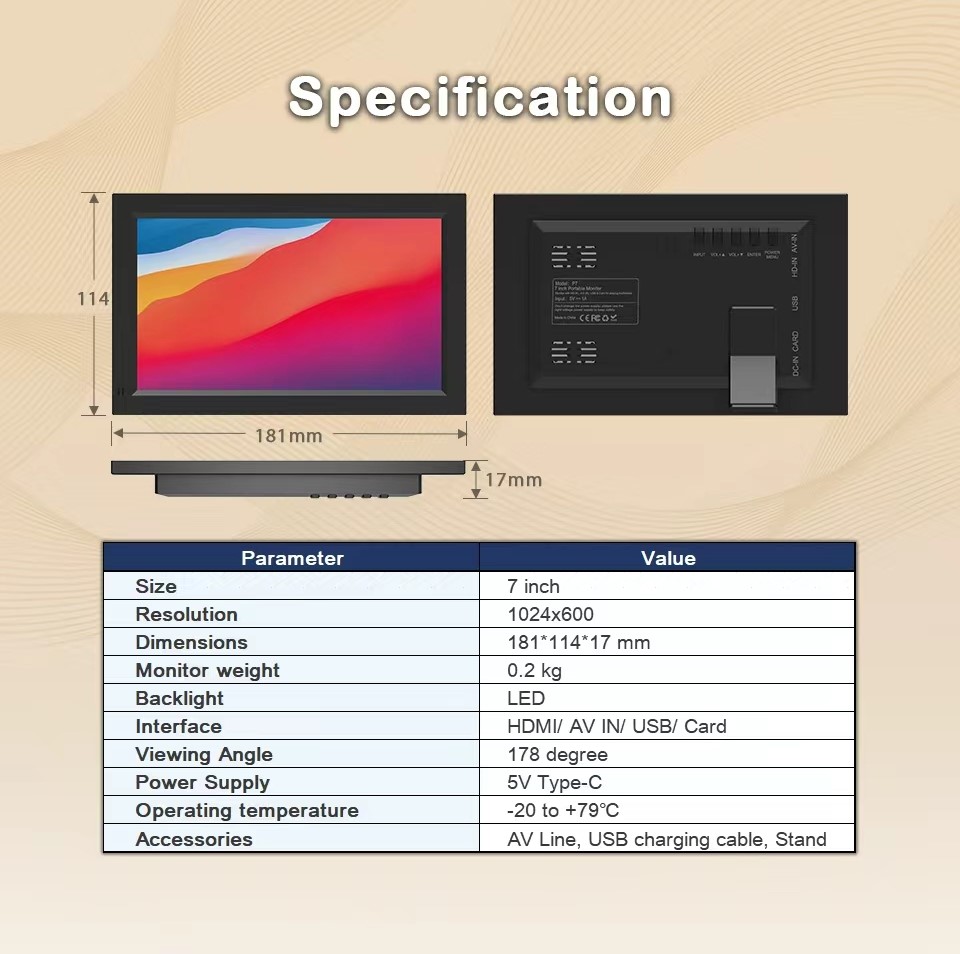 * 7 Inches Monitor: high resolution 1024*600 RGB, Aspect ratio 16:9. With NTSC / PAL video color system. Brightness and Contrast can be adjusted