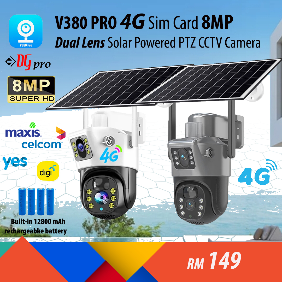 V380 PRO Dual Lens Dual Screen 4G Sim Card / Wifi Solar Powered 8MP PTZ Weatherproof Wireless CCTV Camera