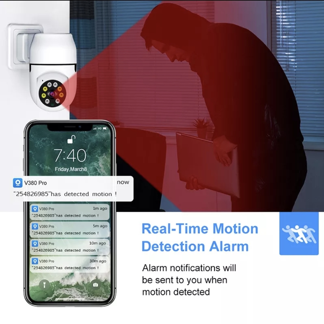The camera detects the moving person. Build-in siren, Can send push notification message to phone app.